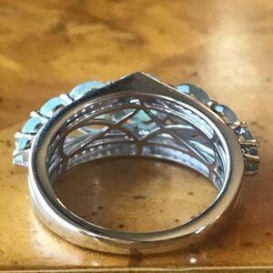 This ring is absolutely gorgeous! It features 3.15 ctw of earth mined grandidierite. The largest stone measures about 6 mm. The ring additionally has natural white zircon accents. All of the stones on this ring are completely natural and untreated. The ring is additionally set in solid .925 sterling silver with a rhodium finish. This piece is sure to bring lots of complements and should last for many years to come. The ring in the photos is the actual one you will receive, so please see photos for gemstone quality and measurements. Size 7