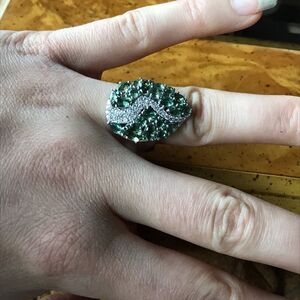 This gorgeous statement piece features all genuine, earth mined stones. The green stones are apatite mined from Africa, and the clear stones are natural white zircons. The ring is set in solid .925 sterling silver with a rhodium plate to prevent tarnishing. The ring has an artistic river design. Please see photos for gemstone quality and measurements. Size 5.