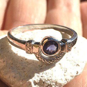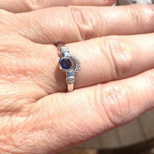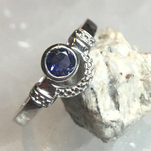 Genuine Iolite round faceted gemstone set in an unusual design .925 Sterling Silver ring. Iolite is a natural blue gem and is untreated. The setting features an elaborate embellished arc along one side of the center stone and on the shoulders. Great piece of fine jewelry to wear with casual or fancy outfits.
