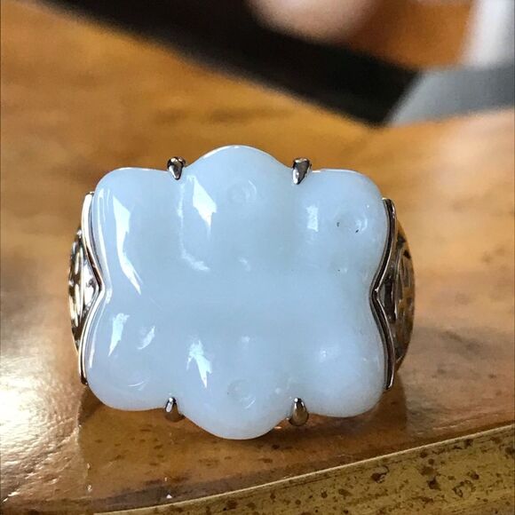 This ring features 18 ctw of completely natural, earth mined jade. The ring has the Chinese Fu symbol, which means happiness, blessings, and good fortune. The ring is set in solid .925 sterling silver with a rhodium plate to prevent tarnishing. The ring in the photos is the one you will receive, so please see photos for gemstone quality and measurements. Discounted due to minor discoloration. There are a couple of very tiny mineral deposit spots, as seen. Size 9.
