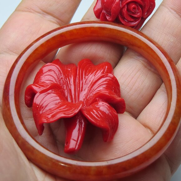 "Natural Jade bangle + REE manmade Coral carved figurine 50mm "