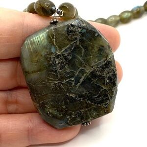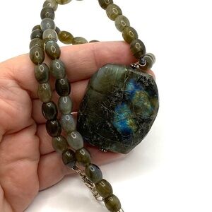 A beautiful necklace features Faceted Labradorite Pendant and smooth labradorite beads with 925 findings.