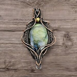 This is a handmade copper wire wrapped natural labradorite gorgeous blue with green fire pendant. The artistry is exquisite and solid. This pendant comes with an 18 inch copper chain with a lobster claw closure. This copper has a rose tone to it like a rose copper instead of like a rose gold, and it brings out the beautiful, almost musical movement of the fire and colors of labradorite. Especially a green or blue one. The blue fire that shines through it is stunning and eye catching, and as it catches different lights as it changes position through natural movement. Each pendant has a natural stone, so the colors and fire with vary, but natural, fire-y but or blue green guaranteed.