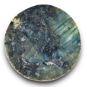 A stunning natural Labradorite disc intricately carved with an evil eye design. Known for its healing properties, this piece serves as a powerful protector, perfect for spiritual well-being and warding off negativity.
