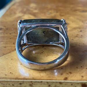 This beautiful ring features a completely natural, earth mined labradorite stone from Madagascar. The stone measures 18x12mm. The ring is set in solid .925 sterling silver with a rhodium plate to prevent tarnishing. The ring in the photos is the actual one you will receive, so please see photos for quality and measurements. Size 7.