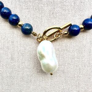 Stunning natural lapiz lazuli beaded necklace with a large, stunning natural baroque pearl as the focal point of the necklace. The necklace is adorned with an 18K gold PVD-coated, high-grade stainless steel toggle closure, which ensures it will never tarnish.