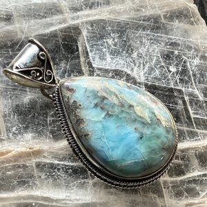 Polished larimar crystal stone pendant in an ornate silver setting.