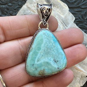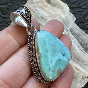 Polished larimar crystal stone pendant in an ornate 925 silver plated setting.