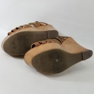 These cute high wedge heel Natural Leather Woven Sandals are in almost new condition. Take a look at the pictures. The heels are high about 5". The color is natural leather. These great little shoes are UNBRANDED. The soles have some soiling but are in great condition. The heels are a faux wood look and have very little flaws, some small discolorations & scratches, but they are undamaged. Super cute little shoes for your stylish wardrobe, make them yours today! SHH-2 PM