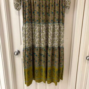 Natural Life Auguste boho maxi dress in chartreuse floral print. 3/4 sleeves. Tiered floral patterns. Keyhole and tassel tie at neckline.