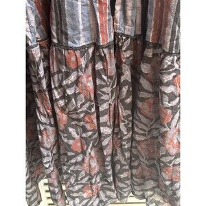 This is a preowned Natural Life Ayla Boho cotton kimono duster. The dress has a tie front, a v-neckline, a ruffled waistline, and ruched tie sleeves. The dress has a distinctive bohemian, hippie, and nature-inspired style. It includes ruffle detailing at the waistline and a tiered bottom. The short sleeves are ruched and feature tie details. The fabric has a striped and floral print with a mix of gray, maroon, and black colors. This can be worn open over jeans -d a top, or closed over a slip as a maxi dress. The options are endless.