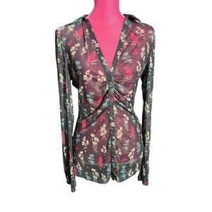 Natural Life Carina Floral Mesh Sheer Button Front Top Boho Womens Sz L Whimsigoth