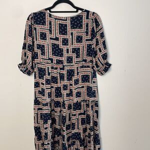 Woven maxi dress features elbow length smocked sleeve and mixed print tiers