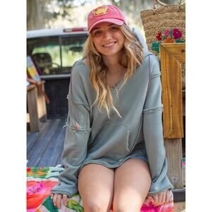 Natural Life Cotton Weekend Hoodie Bay Green Distressed Raw Hem Pullover