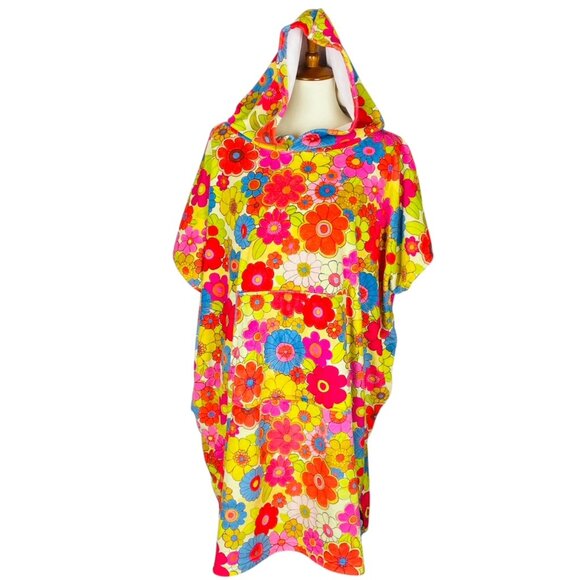 Natural Life Hooded Cover Up OS Pullover Poncho Floral Hippie Mod Retro Beach