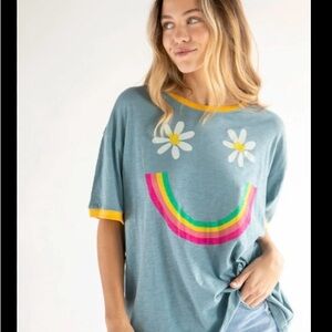 Dusty blue tee with yellow trim and smiley face graphic. Comfortable and fun with a relaxed vintage vibe.