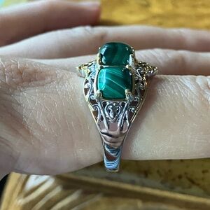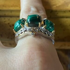This ring is stunning. It features all natural, earth mined gemstones. The green stones are malachite mined in Africa. The ring additionally has completely natural white zircon accents. The total carat weight on this piece is 7.10, and the largest malachite stone measures 8x8. The ring is set in solid .925 sterling silver with a rhodium finish. The ring additionally has 18k yellow gold vermeil accents on the face for the illusion of a crown. The ring in the photos is the actual one you will receive, so see photos for quality and measurements. Size 10.