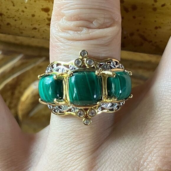 This ring is stunning. It features all natural, earth mined gemstones. The green stones are malachite mined in Africa. The ring additionally has completely natural white zircon accents. The total carat weight on this piece is 7.10, and the largest malachite stone measures 8x8. The ring is set in solid .925 sterling silver with a rhodium finish. The ring additionally has 18k yellow gold vermeil accents on the face for the illusion of a crown. The ring in the photos is the actual one you will receive, so see photos for quality and measurements. Size 6.