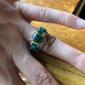 This ring is stunning. It features all natural, earth mined gemstones. The green stones are malachite mined in Africa. The ring additionally has completely natural white zircon accents. The total carat weight on this piece is 7.10, and the largest malachite stone measures 8x8. The ring is set in solid .925 sterling silver with a rhodium finish. The ring additionally has 18k yellow gold vermeil accents on the face for the illusion of a crown. The ring in the photos is the actual one you will receive, so see photos for quality and measurements. Size 6.
