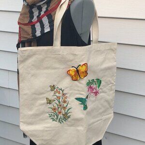 Tote around your belongings and tools with this natural canvas tote bag with 2 large front pockets. This beige bag is constructed of canvas and features two large pockets on the front and two handles for carrying. Embroidered with a springe-theme; hummingbirds, honeybees, butterflies and flowers . There is a 3D hummingbird on the top right corner on the front of the bag and a 3D butterfly in the middle of the back of the bag. Fill this up to your heart's content and use the fabric handles to take it wherever you go! Endlessly durable while the bottom and handles are reinforced so it can support a heavy load, making it perfect as a beach bag, to carry your laptop – whatever you require