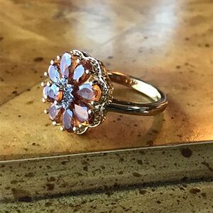 This pretty ring is made with all completely natural, earth mined hessonite garnets and white zircons. None of the stones have been treated in any way, only polished for jewelry. The metal used is solid .925 sterling silver with an 18k yellow gold vermeil. The ring in the photos is the actual one you will receive, so please see photos for gemstone quality/natural inclusions and measurements. The ring measures slightly over a size 5, approximately a 5.25.
