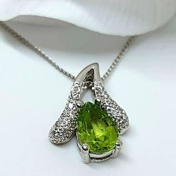 Natural Peridot 9x6mm & Cz 14K White Gold Plate 925 Sterling Silver Necklace