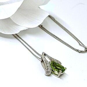 Natural Peridot 9x6mm & Cz 14K White Gold Plate 925 Sterling Silver Necklace 18"