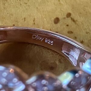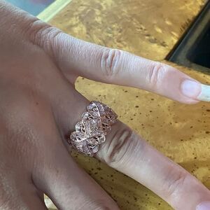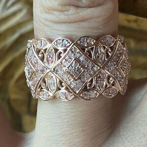 This beautiful ring features one half carat of real, earth mined pink diamonds. These are not lab created gemstones. The stones are completely natural and not treated in any way. The diamonds are uncut, making for a rustic, unique piece. Additionally, pink diamonds are one of the most rare types of diamonds, so this piece is perfect for a collector. The ring is set in solid .925 sterling silver with an 18k rose gold vermeil. This ring is gorgeous and perfect for a unique spin on a typical white diamond ring. The ring in the photos is the actual one you will receive, so please see photos for quality and measurements. Size 6.
