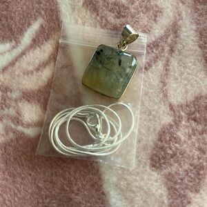 Natural Prehnite Pendant Necklace with Tourmaline Inclusions – 925 chain