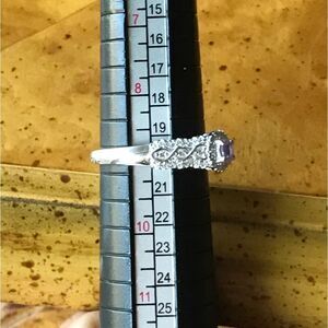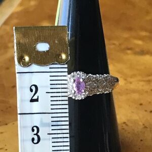 This elegant ring is more on the dainty side, but it certainly is beautiful! It features all genuine, earth mined gemstones. The centerpiece is a natural pinkish purple sapphire (heated) that was mined in Madagascar. The stone measures 4x3 mm. The ring additionally has natural white zircon accent stones. Total carat weight is 0.75. The ring is set in solid .925 sterling silver with a rhodium finish. Sapphires are very durable stones, making this piece perfect for daily wear. The ring in the photos is the actual one you will receive, so please see photos for gemstone quality and measurements. Size 9.