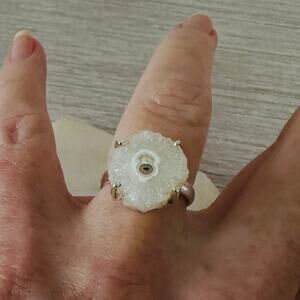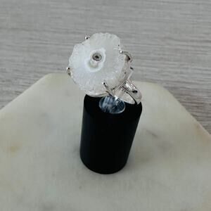 This ring features a natural quartz stalactite slice, set in a 925 sterling silver band. The quartz slice is unique and has its own natural markings and inclusions, making it a one-of-a-kind piece. The sterling silver band is sturdy and comfortable to wear. This ring is a size 8.
