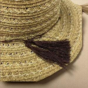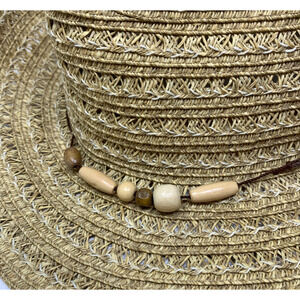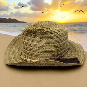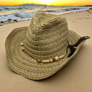 Natural Raffia Straw Cowboy Hat Wooden Beaded Band Tassel Packable Festival OSFM