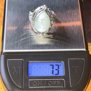 This beautiful ring features completely natural, earth mined rainbow moonstone. The center moonstone measures 16x11 mm. The ring is set in solid .925 sterling silver, making it perfect for regular wear. The ring in the photos is the actual one you will receive, so please see photos for quality and measurements. Size 7.