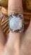 This beautiful ring features completely natural, earth mined rainbow moonstone mined in India. The moonstone measures 14mm. The ring is set in solid .925 sterling silver with a rhodium plate to prevent tarnishing. The ring in the photos is the actual one you will receive, so please see photos for quality and measurements. Size 6.