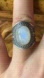 This beautiful ring features completely natural, earth mined rainbow moonstone mined in India. The moonstone measures 14x10 mm. The ring is set in solid .925 sterling silver, making it perfect for daily wear. The ring in the photos is the actual one you will receive, so please see photos for quality and measurements. Snug size 6.