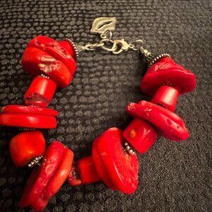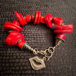 Thank you for looking at this Natural Red Coral Bracelet Beaded Chunky Lips Charm Silver Handmade Boho Large