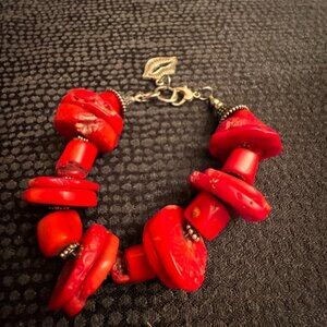 Natural Red Coral Bracelet Beaded Chunky Lips Charm Silver Handmade Boho Large