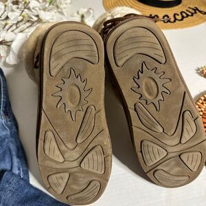 Gently used. Wear is shown in pics. A little bit of wear to the suede and a spot on and near the faux fur in back. perfect for chilly days, snowy adventures, or casual outings.