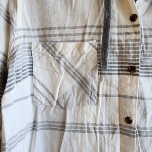 features a 3-piece drawstring hood, 2 chest pockets, and a full button-down front