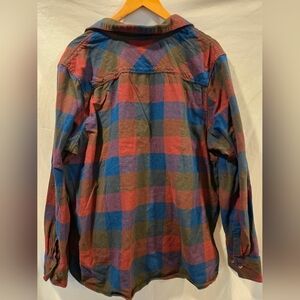 Vibrant plaid shirt with button closure. Features a blend of red, blue, and green shades. Super soft, super durable, super cozy. I liked this shirt so much, I just bought another one in my current size :)
