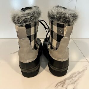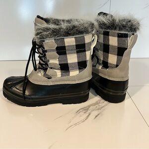 Cozy and durable winter boots. Black and gray plaid design. Perfect for snowy days.