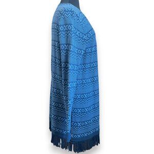 Pair this long fringed sweater with jeans and boots or wear it with everyday yoga pants while out and about. The soft knit features a repeating geometric pattern in light blue and dark blue.