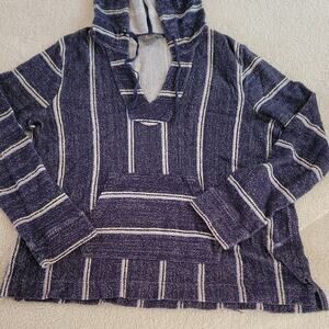 Cozy V-neck sweater with a hood. Features navy and white stripes. Perfect for casual outings.