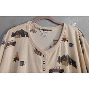 Find yourself and get comfortable after a fun day outdoors with our long -sleeved Henley shirt with Reflections® Natural Campist Stint for Women. This pajama shirt has a Henley mat with pressure brooches to put it on and take it easily. The fabric has a print inspired by a campsite, with a tent, mountains, a backpack and an off -road vehicle. Long (based on size XXL,26.5 Inch Of Armp To Armp and 26 inch Long measurement, Polyester recicled Spandex.