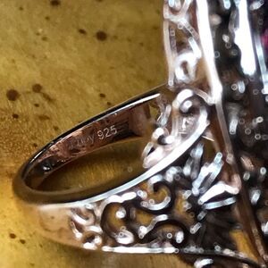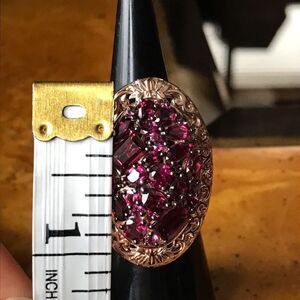 This beautiful, statement piece is made of genuine, earth mined rhodolite garnet (5.60 ctw). It is set in solid .925 sterling silver with a 18k rose gold vermeil. This ring has a face measurement of slightly over an inch and is sure to bring complements. The ring in the photos is the actual one you will receive. Size 5.25.