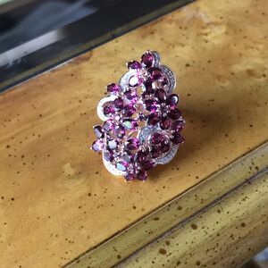 This ring is stunning. It is made with real, earth mined rhodolite garnet and natural white zircon accents. The gemstone carat weight on the ring is 8.22. The ring is set in solid .925 sterling silver, and it has a 14k rose gold vermeil. The face of the ring is just under an inch and a half in length, as shown. The ring in the photos is the actual one you will receive. Size 7.