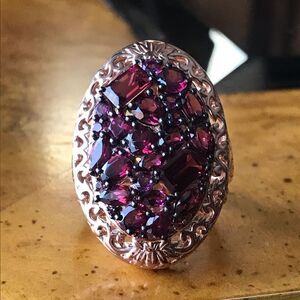 This beautiful, statement piece is made of genuine, earth mined rhodolite garnet (5.60 ctw). It is set in solid .925 sterling silver with a 18k rose gold vermeil. This ring has a face measurement of slightly over an inch and is sure to bring complements. The ring in the photos is the actual one you will receive. Size 7.
