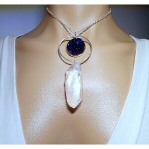 Natural Rock Crystal Quartz Point Titanium Blue Quartz Silver Necklace