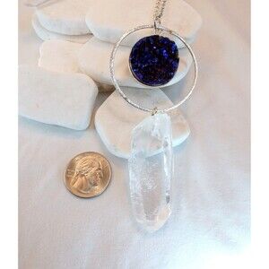 This Bohemian Necklace is created with titanium quartz pendant set in sterling silver, hanging with a large rock quartz specimen. You could also hang this from your rear view mirror. Chain is 16 inches and silver plated.
