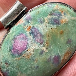 Pendant of a stunning natural ruby fuschite kyanite crystal stone in a silver frame.